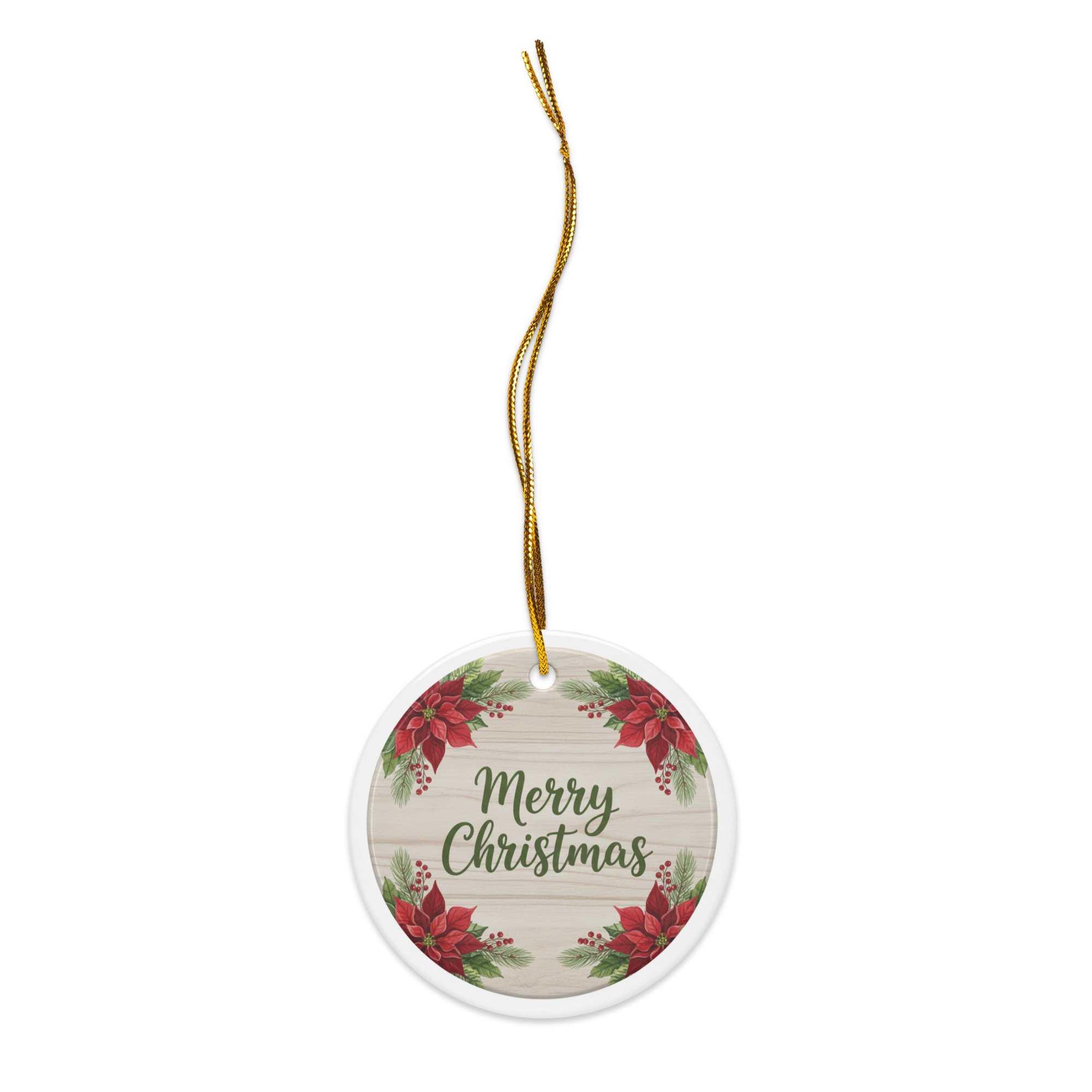Bring timeless farmhouse charm to your tree with this Rustic Christmas Ornament. Featuring a faux wood background with watercolor poinsettias, pine greenery, and festive red berries, this two-sided ceramic ornament captures the cozy warmth of country holiday décor.